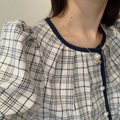 パールボタンとパイピングが大人可愛いパフスリーブチェックトップス。
