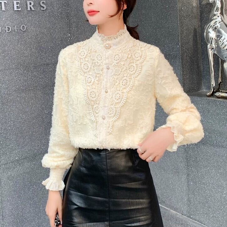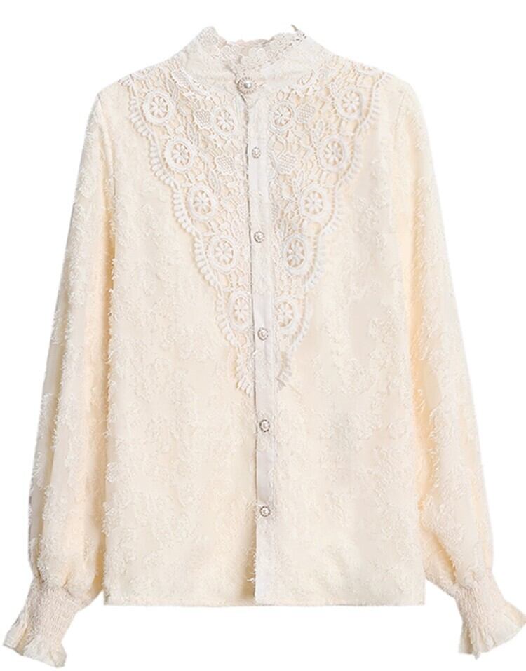 胸元のレースと袖のフリルが上品で華やかな長袖トップスです。