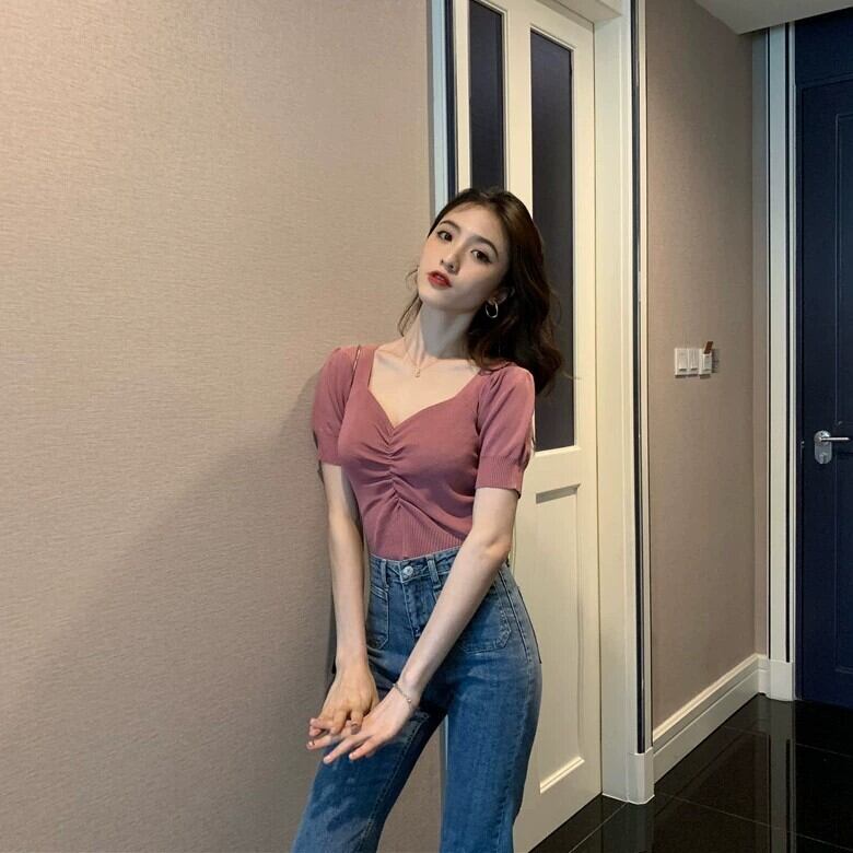 胸元がざっくりあいてスッキリと涼しげで綺麗な半袖ニットです。