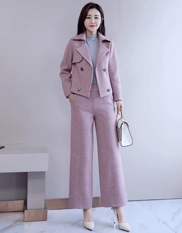 トレンドのダブルプレストジャケットとワイドレッグパンツの2点セットで、大人可愛い、きれいめな印象を与えるスタイルに仕上げています。