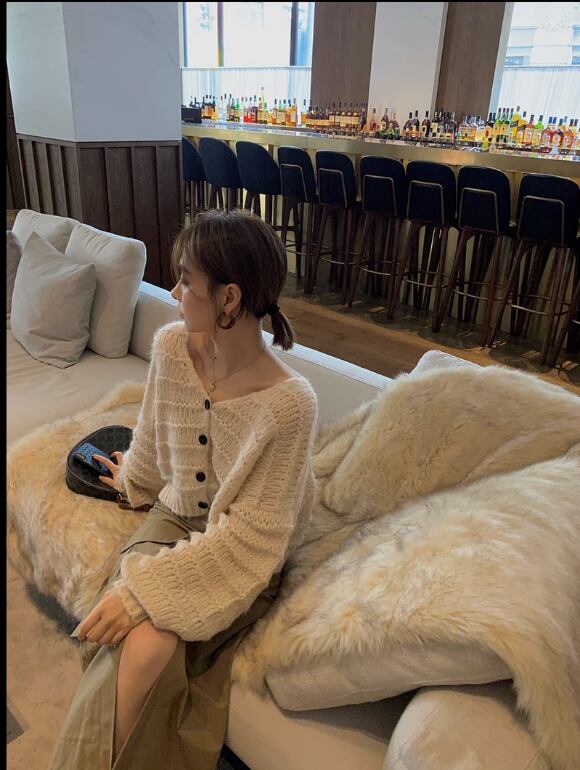 ワイドなシルエットで、前開きの編み物がかわいらしさと大人っぽさを兼ね備えています。
