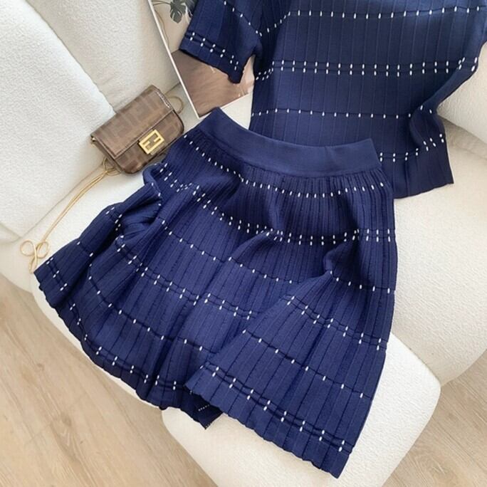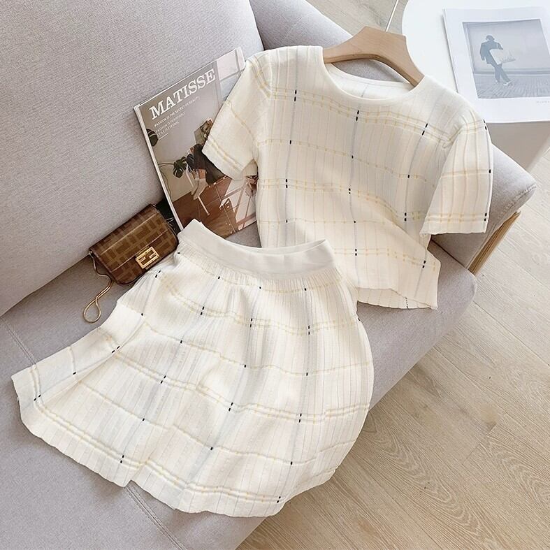 薄手のニットで軽やかで涼し気な半袖トップスとミニスカートの上下セットです。