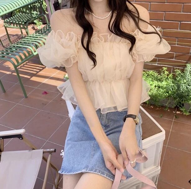トップス シャツ ブラウス 白シャツ 白トップス ショート丈 袖あり 半袖 パフスリーブ オフショルダー オフショル 襟なし シフォン フリル ふわふわ 透け感 ペプラム かわいい 大人可愛い カジュアル 大人 おしゃれ お洒落 大人女子 ラフ ラブリー キュート ガーリー 主役級 存在感 とろみ感 無地 夏 10代 20代 30代 レディース ママ OL 学生 デート お出かけ 休日 イベント リゾート 旅行 海 プール 着回し 韓国系 オルチャン モテ インスタ映え フリーサイズ アプリコット