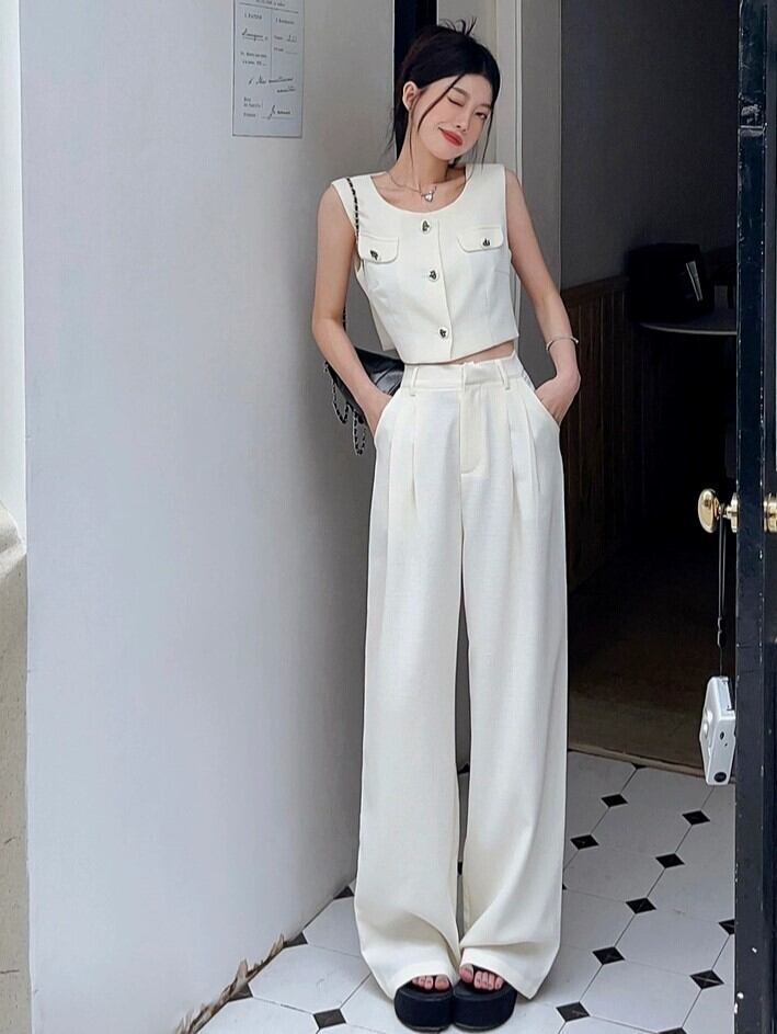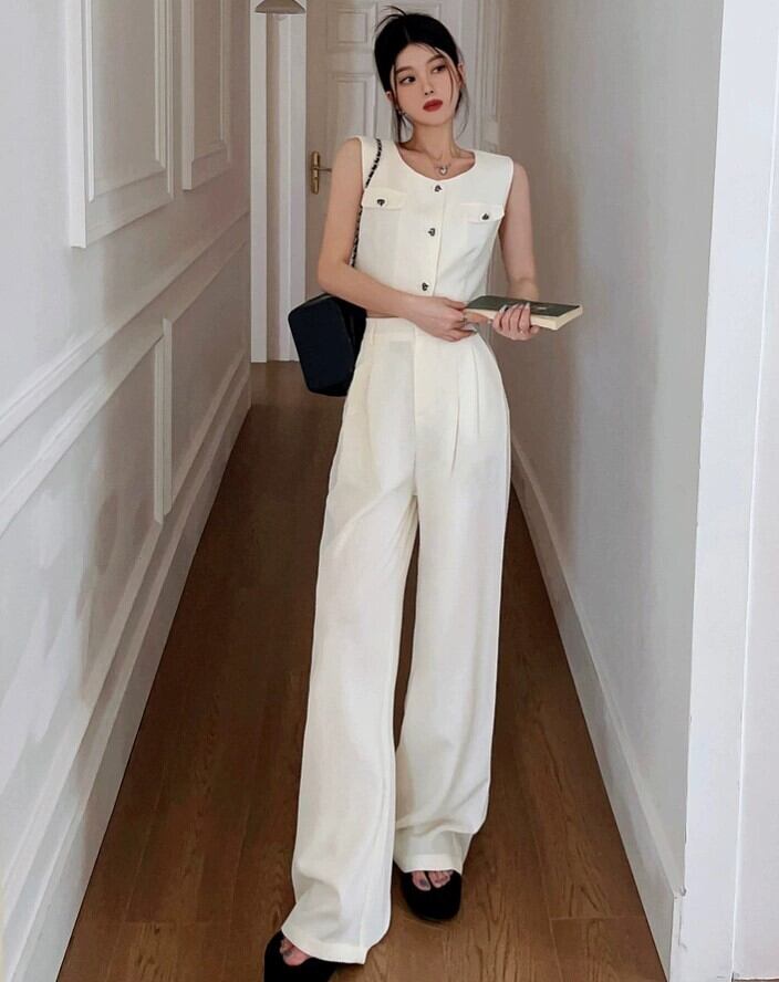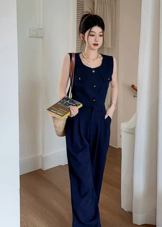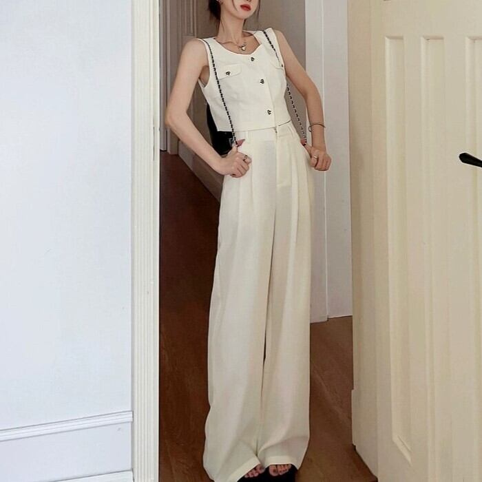 ボタンがついてお洒落なシルエットのノースリーブとタックが入り綺麗なシルエットのパンツの2点セットです。