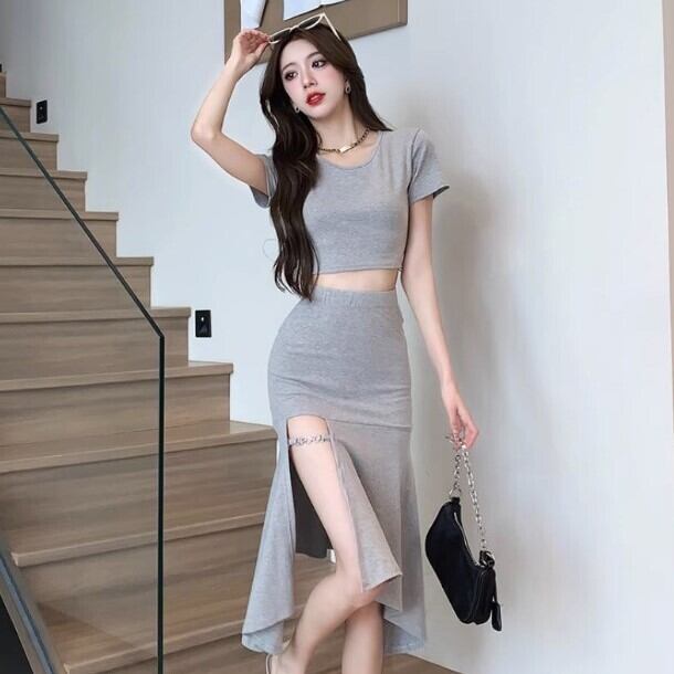 セットアップ Tシャツ プルオーバー マーメイドスカート ショート丈 ミモレ丈 半袖 ラウンドネック 襟なし マーメイド スリット バックシャン バックコンシャス 上下セット 2点セット 大人可愛い きれいめ 上品 おしゃれ 大人女子 こなれ感 個性的 クール セクシー モダン 主役級 存在感 抜け感 無地 夏 誕生日 10代 20代 30代 40代 レディース ママ OL 学生 デート お出かけ 休日 イベント リゾート ホテル レストラン オルチャン コーデ 脚長 インスタ映え S M L 2色展開