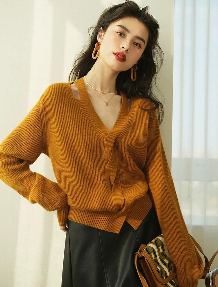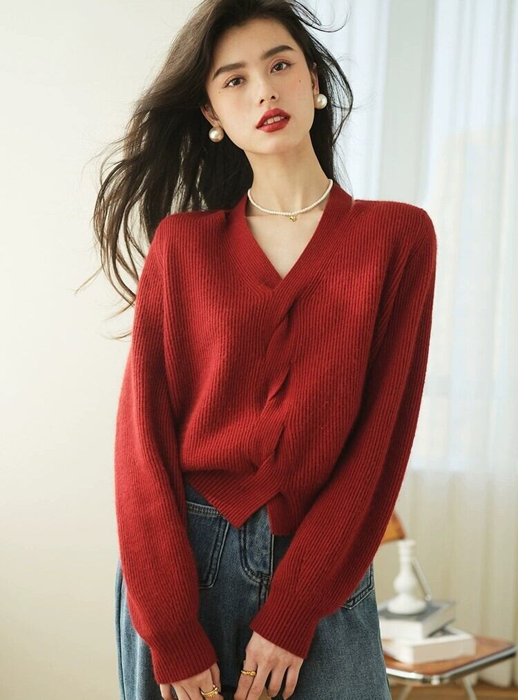 Vネックで前のねじれたデザインが個性的でお洒落な長袖セーターです。