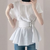 トップス シャツ カットソー 白トップス 半袖 ラウンドネック ペプラム ベルト ウエストマーク 2way 透け感 薄手 かわいい 大人可愛い きれいめ シンプル カジュアル 大人 おしゃれ お洒落 大人可愛い 大人女子 こなれ感 ラブリー キュート ガーリー エレガント 存在感 とろみ感 抜け感 無地 夏 10代 20代 30代 40代 レディース 女性用 ママ 通勤 学生 デート お出かけ 女子会 休日 イベント リゾート 旅行 海 着回し 普段使い モテ S M L XL ホワイト