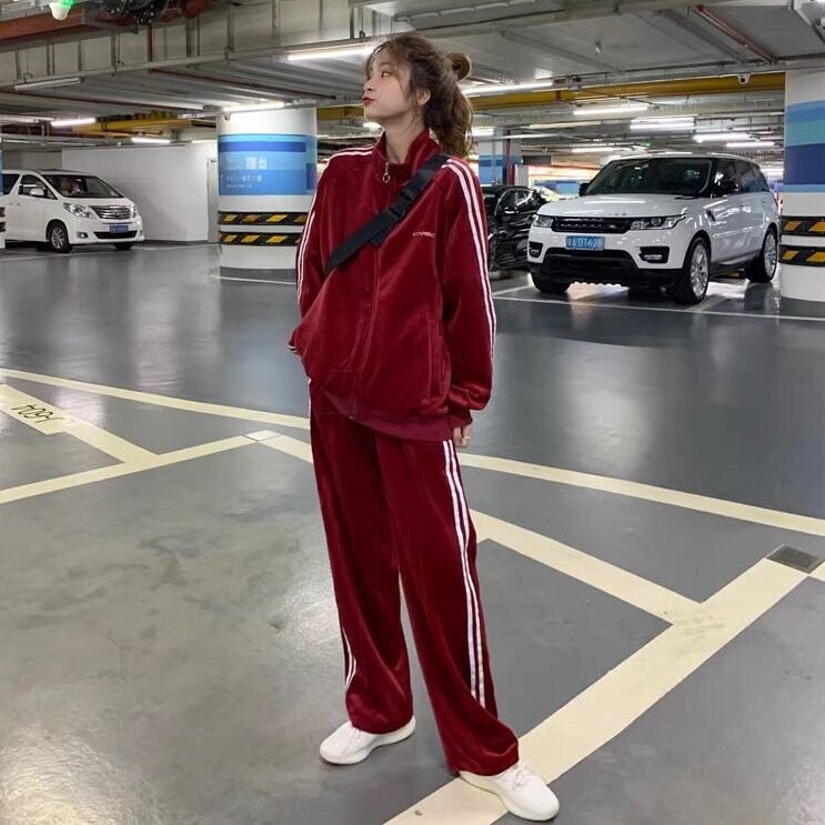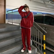 オシャレで可愛く、一枚でコーディネートが完成するベロア風ジャージのセットです。