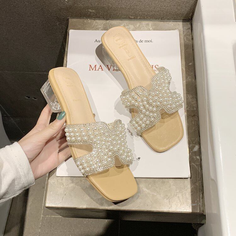サンダル ミュールサンダル 4.5㎝ヒール スクエアトゥ パール ビジュー キラキラ オープントゥ かわいい 大人可愛い きれいめ 大人 おしゃれ お洒落 エレガント きちんと感 ガーリー 大人っぽい 女っぽ ラフ ルーズ セクシー 主役級 存在感 パールビーズ 春 夏 20代 30代 40代 レディース イベント ファッション コーデ スタイル モテ インスタ映え サイズ 22.5cm 23.0cm 23.5cm 24.0cm 24.5cm 色展開 ライトグリーン ブラック ベージュ アプリコット