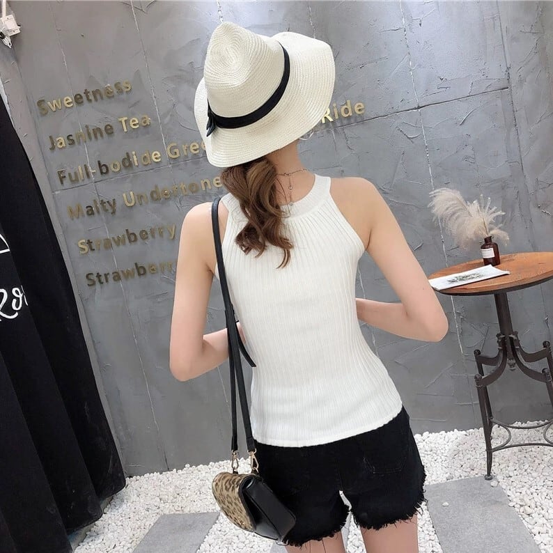 ラウンドネックのデザインがお洒落で、リブが入りスッキリ感のあるノースリーブトップスです。