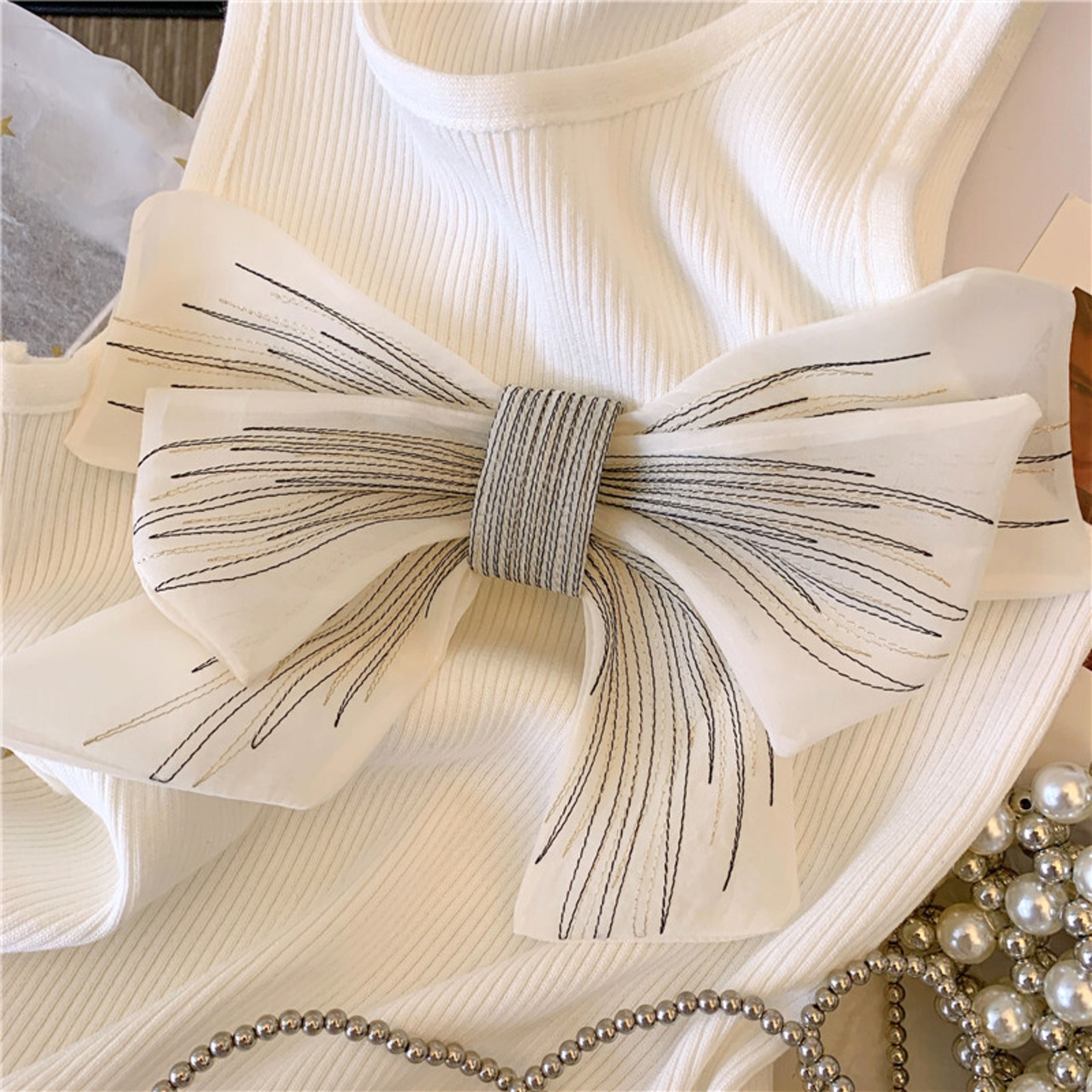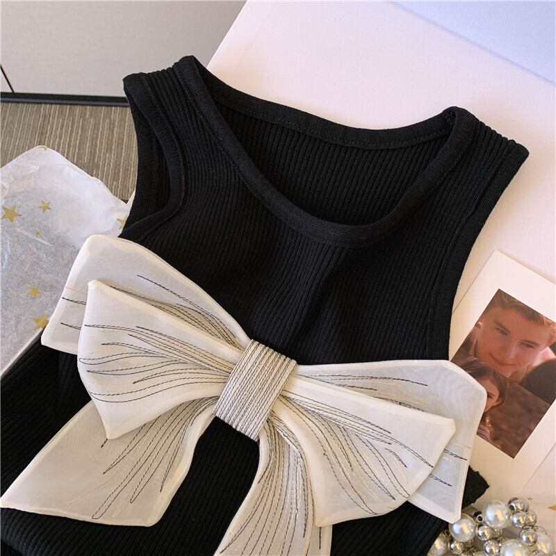 フロントの大きなリボンがかわいいノースリーブリブニットトップス。