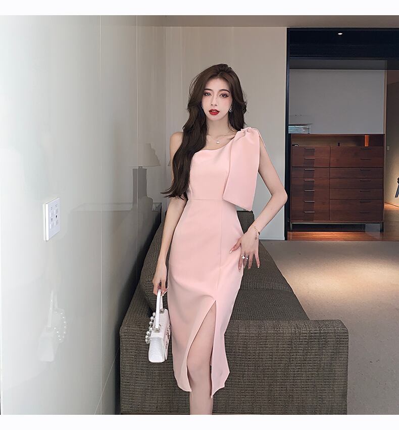ワンピース レディース 膝丈 袖なし ノースリーブ ワンショルダー 襟なし タイト スリム 細身 リボン スリット ハイウエスト かわいい 大人可愛い きれいめ シンプル 上品 おしゃれ こなれ感 ラフ ガーリー 個性的 エレガント 主役級 存在感 抜け感 ラブリー キュート 都会的 ベーシック ロマンティック 無地 春 夏 デート お出かけ パーティー イベント コーデ 美脚 脚長 モテ 清楚 トレンド 流行 インスタ映え 定番 S M L XL ピンク ベーシックカラー 大人カラー 春カラー 夏カラー