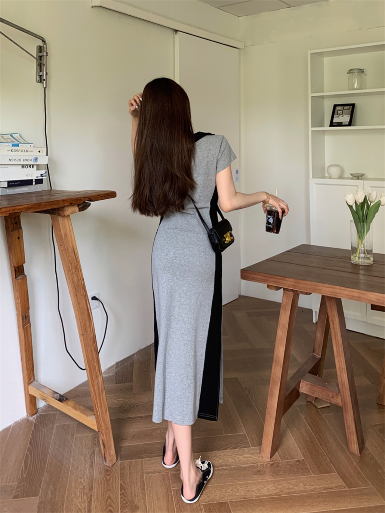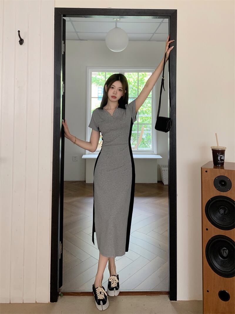 ワンピース レディース 膝下 ロング 半袖 襟付き スタンドカラー タイト スリム 細身 スリット バイカラー かわいい 大人可愛い きれいめ シンプル カジュアル おしゃれ こなれ感 ラフ ルーズ 個性的 クール モード系 エレガント モダン 主役級 存在感 抜け感 都会的 ベーシック ナチュラル 無地 春 夏 デート お出かけ 女子会 休日 ショッピング カフェ モノトーン 美脚 脚長 普段使い 着回し モテ 清楚 トレンド 流行 インスタ映え 定番 L XL 2XL 3XL 4XL ブラック グレー