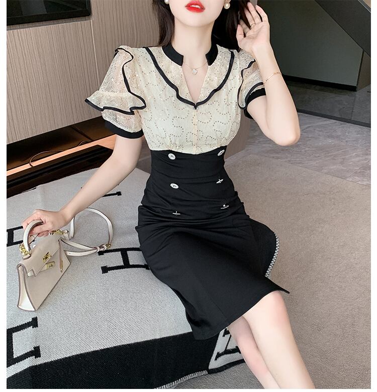ワンピース レディース 膝丈 半袖 Vネック 襟付き タイト スリム 細身 ストレート フェミニン スリット ハイウエスト 切り替えデザイン バイカラー かわいい 大人可愛い きれいめ カジュアル 上品 おしゃれ こなれ感 ラフ ガーリー エレガント 主役級 存在感 ラブリー キュート 都会的 ベーシック ナチュラル 無地 春 夏 デート お出かけ パーティー イベント ショッピング カフェ コーデ 楽ちん 美脚 脚長 モテ 清楚 トレンド 流行 インスタ映え 定番 S M L XL ブラック 大人カラー