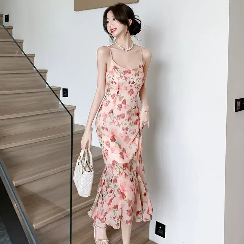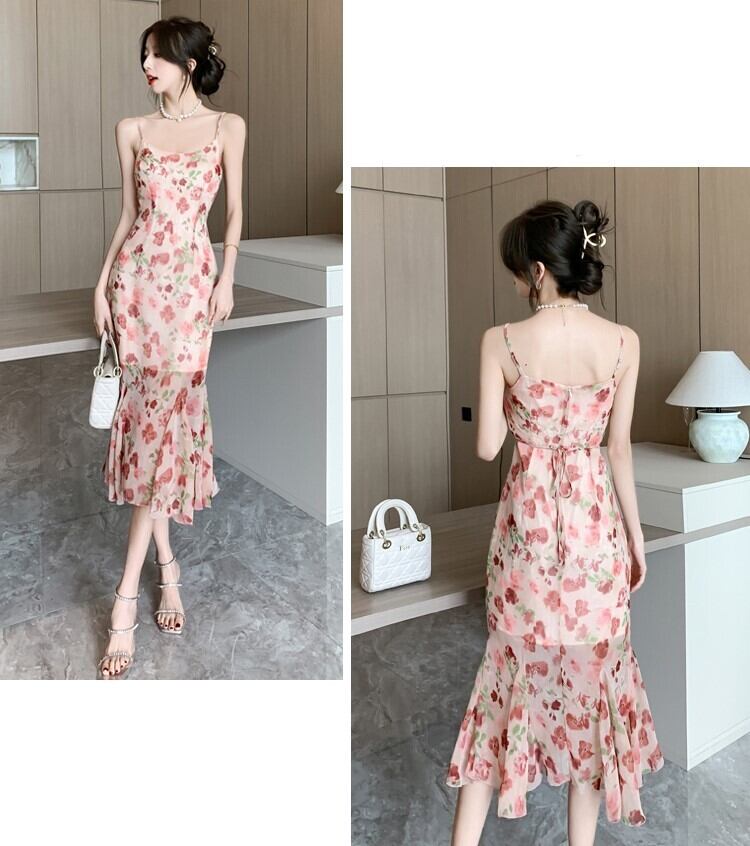 鮮やかな花柄が華やかなキャミワンピースドレス。