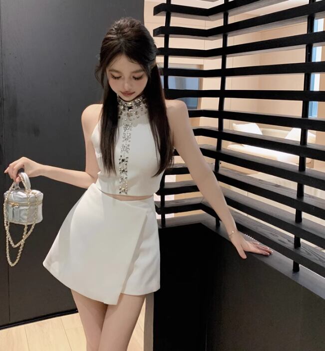 ツーピース セットアップ ミニ 袖なし ノースリーブ ホルターネック 襟なし スリム 細身 ハイウエスト かわいい 大人可愛い きれいめ シンプル 上品 おしゃれ 主役級 存在感 フォーマル 都会的 ラグジュアリー セクシー 無地 夏 秋 レディース 女性用 10代 20代 デート お出かけ パーティー イベント リゾート 旅行 海 レストラン 公園 女子会 休日 バカンス ショッピング 合コン コンパ カフェ 美脚 脚長 普段使い 着回し モテ S M L 白 ホワイト 黒 ブラック カラバリ