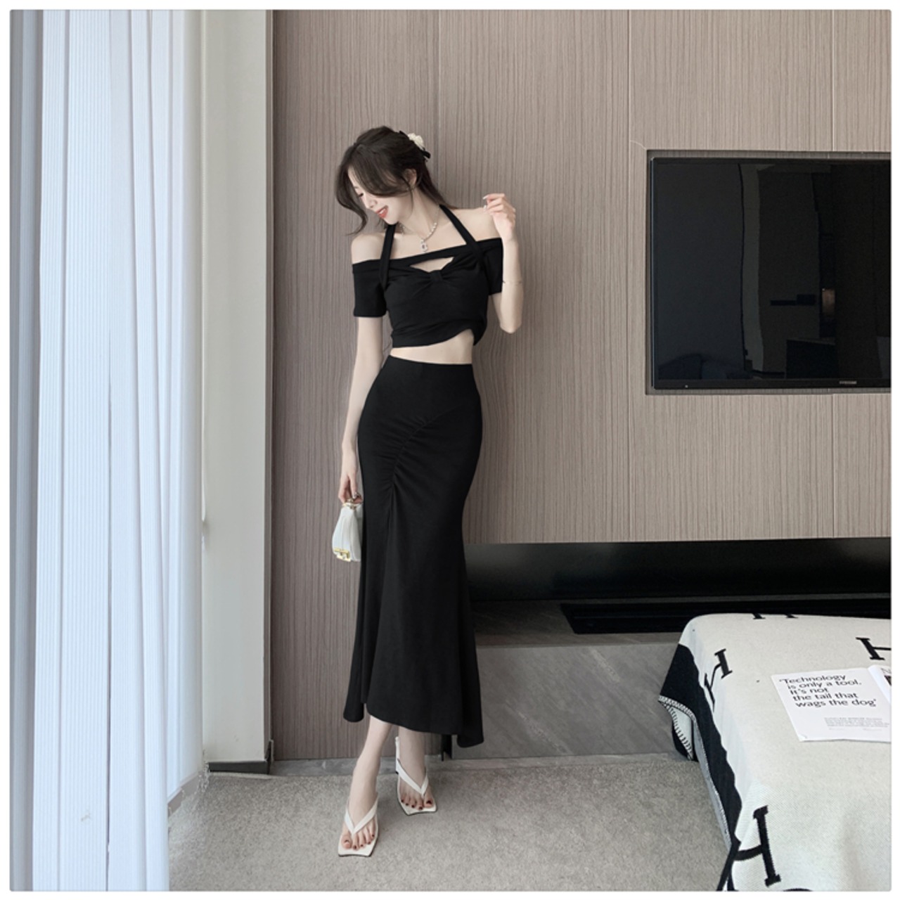 レディース セットアップ ツーピース トップス ボトムス プルオーバースカート ミモレ ロング 半袖 クロスストラップ オープンショルダー スクエアネック ホルターネック スリム Aライン 背中開き フェミニン スリット サイドスリット ハイウエスト 大人可愛い きれいめ シンプル カジュアル おしゃれ こなれ感 主役級 存在感 抜け感 無地 夏 デート お出かけ パーティー イベント レストラン 女子会 休日 ホテル ショッピング カフェ 体型カバー 脚長 普段使い 着回し S M L グレー ブラック
