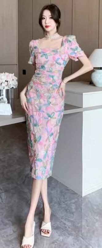 ドレス ドレスワンピース パーティー 結婚式 二次会 披露宴 ステージ キャバ ラウンジ クラブ ミモレ丈 半袖 バルーンスリーブ 袖あり スクエアネック 襟なし マーメイド イブニング ハイウエスト スリッド ポリエステル 可愛い きれいめ 大人可愛い 上品 おしゃれ 主役級 存在感 フォーマル エレガント セクシー 華やか 花柄 柄 イベント 美脚 脚長 高見え 女子会 夏 秋 S M L XL レディース 女性 20代 30代 ピンク 春カラー
