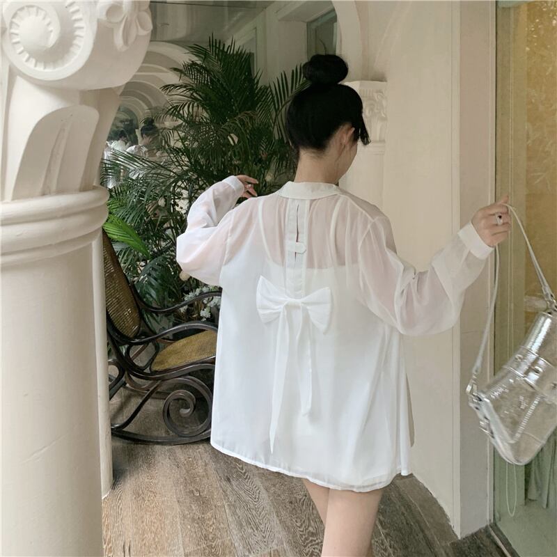 レディース トップス シャツ ブラウス 長袖 萌袖 襟付き 角襟 ワイド バックリボン スリット バックスリット 前開き 透け感 シースルー シアー かわいい 大人可愛い きれいめ シンプル カジュアル おしゃれ こなれ感 ラフ ガーリー 主役級 存在感 抜け感 ベーシック ロマンティック ナチュラル 無地 春 夏 デート お出かけ パーティー イベント リゾート 旅行 レストラン 女子会 休日 ショッピング カフェ フェス 重ね着 普段使い 着回し レイヤード モテ ゆったり フリーサイズ