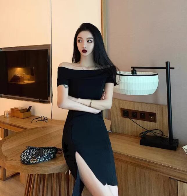 ワンピース ドレスワンピース ショート 半袖 袖あり オフショルダー 襟なし 細身 ストレート Iライン スリット サイドスリット ファスナー ハイウエスト かわいい 大人可愛い きれいめ シンプル おしゃれ かっこいい クール 主役級 存在感 フォーマル 無地 夏 秋 結婚式 二次会 披露宴 レディース 女性用 20代 30代 デート お出かけ パーティー イベント レストラン 女子会 休日 ショッピング 合コン コンパ 美脚 脚長 プチプラ 普段使い モテ S M L XL 黒 ブラック