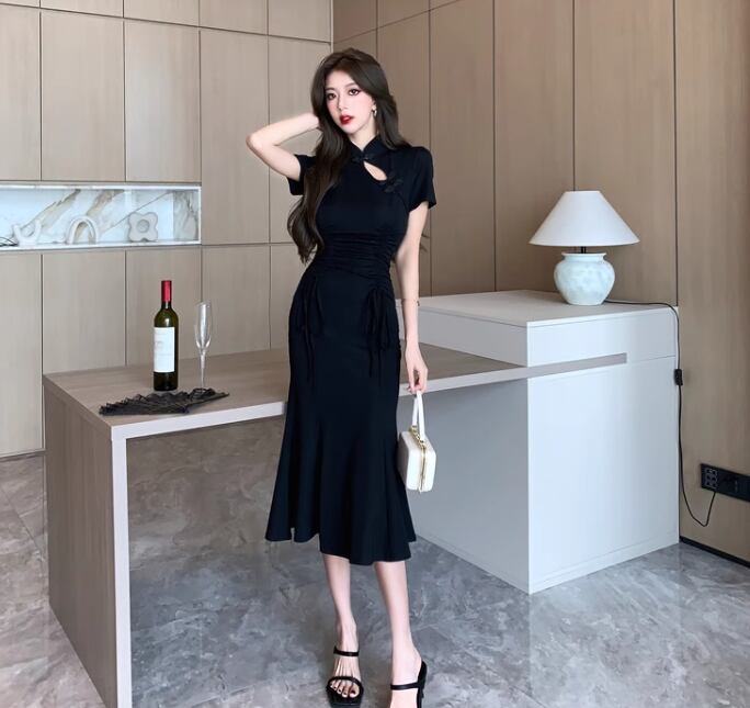 ワンピース ミモレ丈 半袖 袖あり 襟なし スタンドカラー マーメイド フィッシュテール リボン ファスナー ハイウエスト 大人可愛い きれいめ シンプル 上品 おしゃれ ラフ 主役級 存在感 フォーマル 無地 夏 秋 レディース 女性用 20代 30代 デート お出かけ パーティー イベント 旅行 レストラン 女子会 休日 バカンス ショッピング 合コン コンパ カフェ 美脚 脚長 普段使い プチプラ 高見え モテ S M L 黒 ブラック 大人カラー 秋カラー