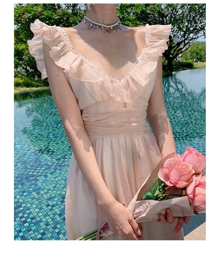 ロング丈ながらも袖なしで涼しげな印象を演出し、Vネックとフリル袖が品のあるエレガンスをプラス。