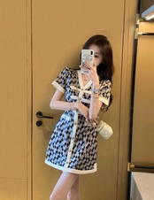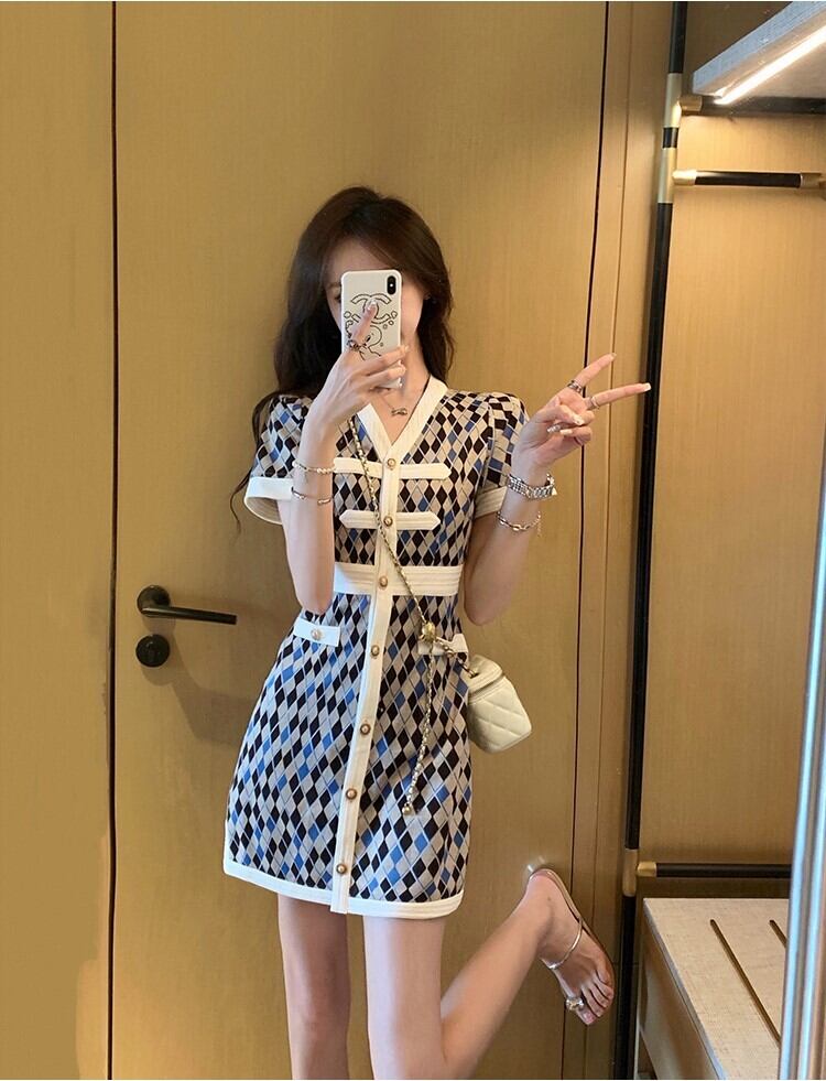 レディース ワンピース ミニワンピ ミニ ミニ丈 半袖 Vネック レトロ ニット タイト スリム フェミニン ポケット ハイウエスト 前開き ボタン 配色 かわいい 大人可愛い カジュアル おしゃれ ガーリー 主役級 存在感 抜け感 ラブリー キュート ダイヤ柄 総柄 夏 デート お出かけ パーティー イベント リゾート 旅行 レストラン 女子会 休日 バカンス ショッピング 合コン コンパ カフェ 韓国 オルチャン コーデ 体型カバー 脚長 普段使い 着回し モテ S M L ブルー ブルー系