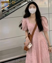 パフスリーブとスクエアネックが女性らしさを引き立て、Aラインのシルエットがスリムな印象を与えます。