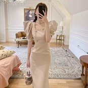 レディース ワンピース ドレス ワンピースドレス ワンピドレス プルオーバー 膝下 ミモレ ロング 半袖 5分袖 ボリューム袖 パフスリーブ スクエアネック タイト スリム フェミニン ボタン ポリエステル 大人可愛い きれいめ シンプル 上品 おしゃれ エレガント 主役級 存在感 フォーマル 都会的 ラグジュアリー 無地 夏 結婚式 二次会 披露宴 デート お出かけ イベント レストラン 女子会 休日 ホテル 韓国 オルチャン コーデ 体型カバー モテ S M L XL カーキ ブラック