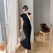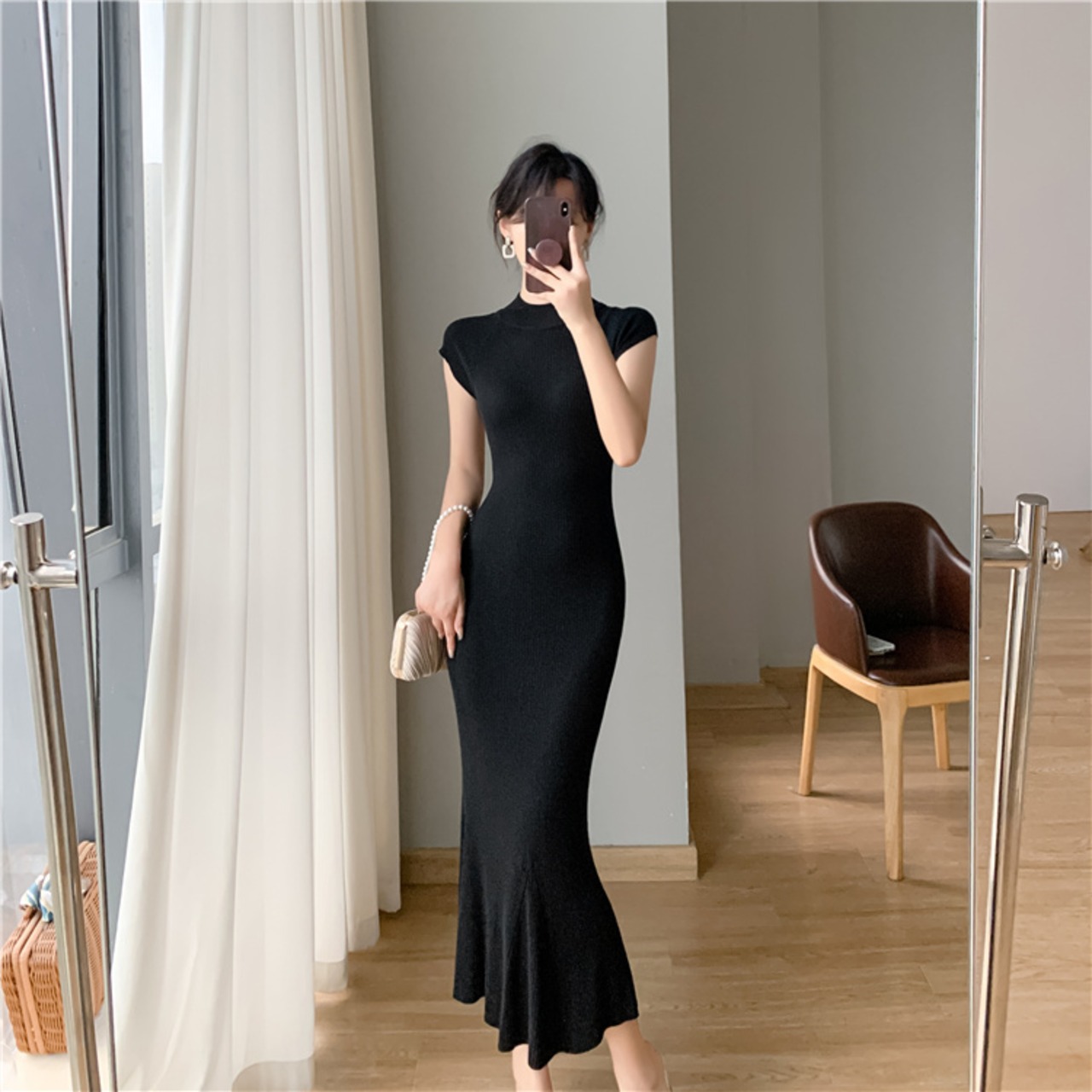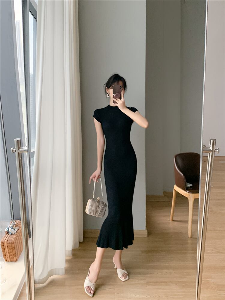シンプルな美ラインのフレンチスリーブマーメイドニットワンピース。