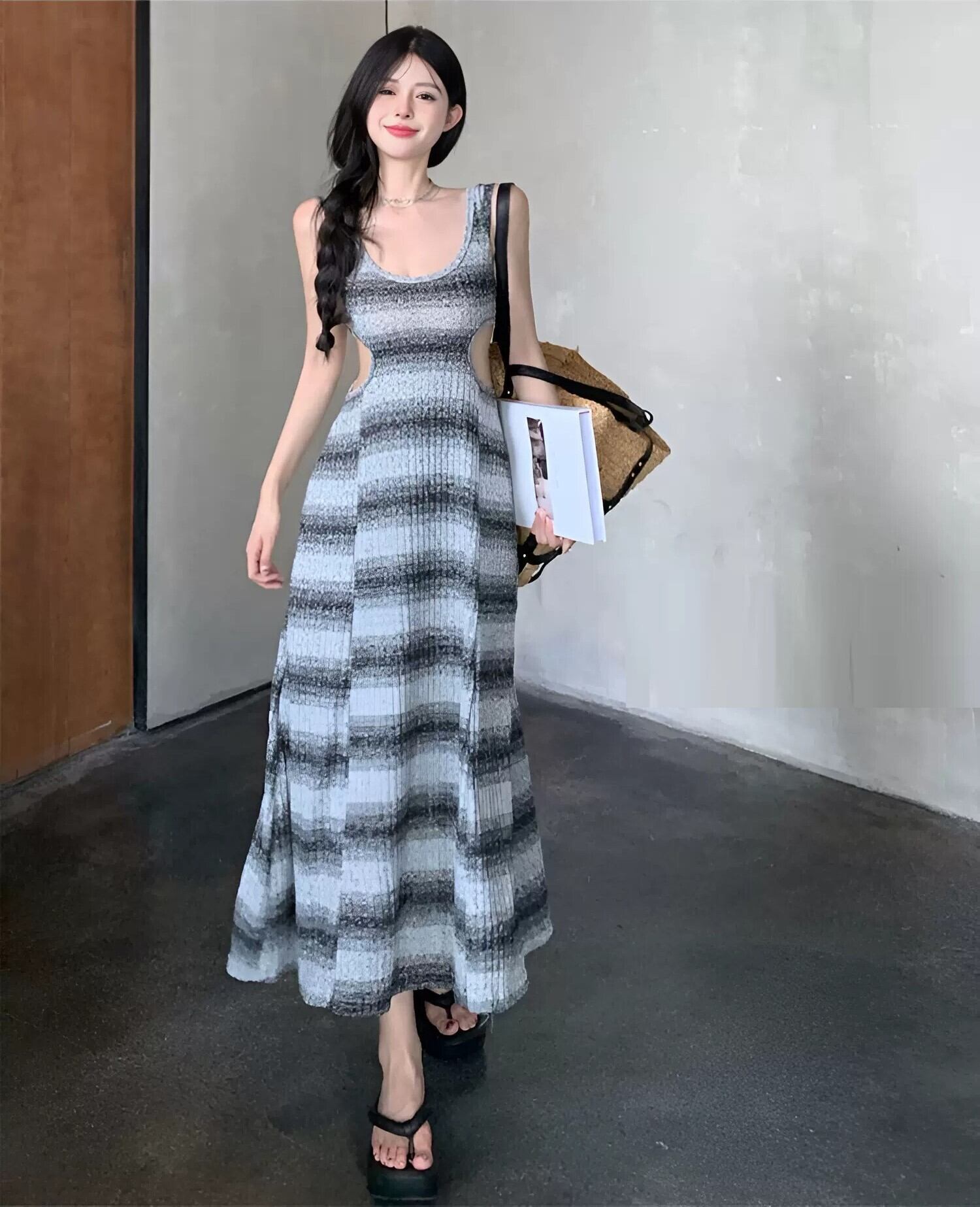 レディース ワンピース ドレス ロングワンピース プルオーバー カットアウト ロング ノースリーブ Uネック スリム Aライン 背中開き フェミニン バックコンシャス ハイウエスト かわいい 大人可愛い シンプル カジュアル おしゃれ こなれ感 ラフ ガーリー 主役級 存在感 抜け感 キュート ナチュラル ボーダー 夏 デート お出かけ イベント リゾート 旅行 海 プール レストラン ビーチ 女子会 休日 バカンス ショッピング カフェ 体型カバー 脚長 普段使い 着回し モテ S M L グレー