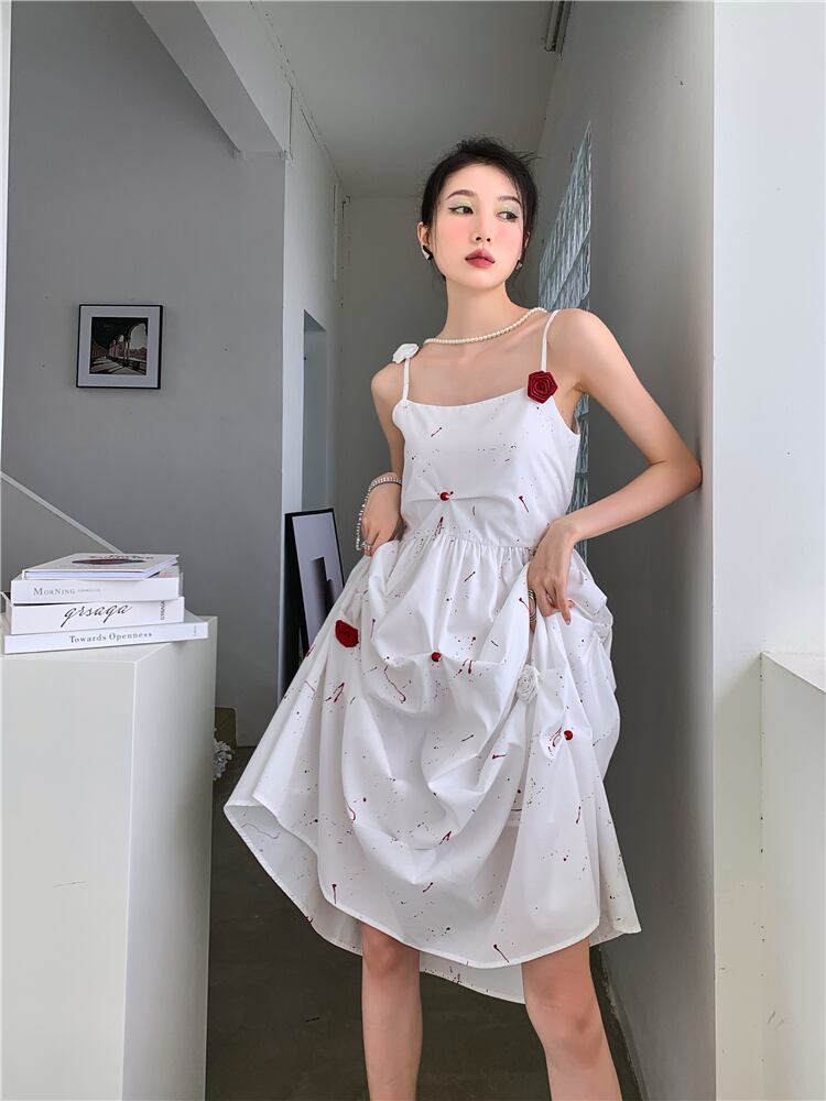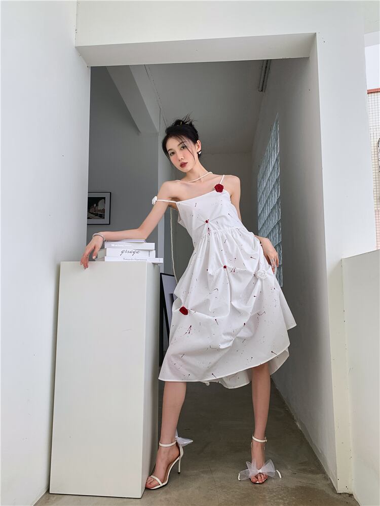 ドレス ワンピース パーティー キャミワンピース キャミワンピ インクモチーフ インク バラ ローズ 発表会 舞台 衣装 コスプレ コスチューム 膝下 ミモレ ロング 袖なし ノースリーブ スクエアネック ストレート セミフレア Aライン リボン ウエストマーク バックシャン バックコンシャス 可愛い シンプル カジュアル かわいい 大人可愛い おしゃれ ガーリー クール モード モダン スタイリッシュ 甘辛MIX 主役級 存在感 抜け感 イベント 脚長 夏 クラブ S M L 体型カバー 白 ホワイト
