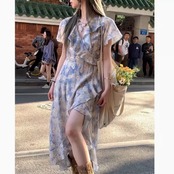 ワンピース レディース ロング 半袖 Vネック 襟なし アシンメトリー ワイド フレア Aライン フェミニン シフォン フリル 透け感 シースルー 薄手 かわいい 大人可愛い きれいめ シンプル 上品 おしゃれ こなれ感 ラフ ガーリー ルーズ 個性的 エレガント 主役級 存在感 抜け感 ラブリー キュート 都会的 ベーシック ナチュラル 花柄 フラワー 総柄 春 夏 デート お出かけ 女子会 休日 ショッピング カフェ 美脚 脚長 モテ 清楚 トレンド 流行 インスタ映え 定番 S M L XL 2XL
