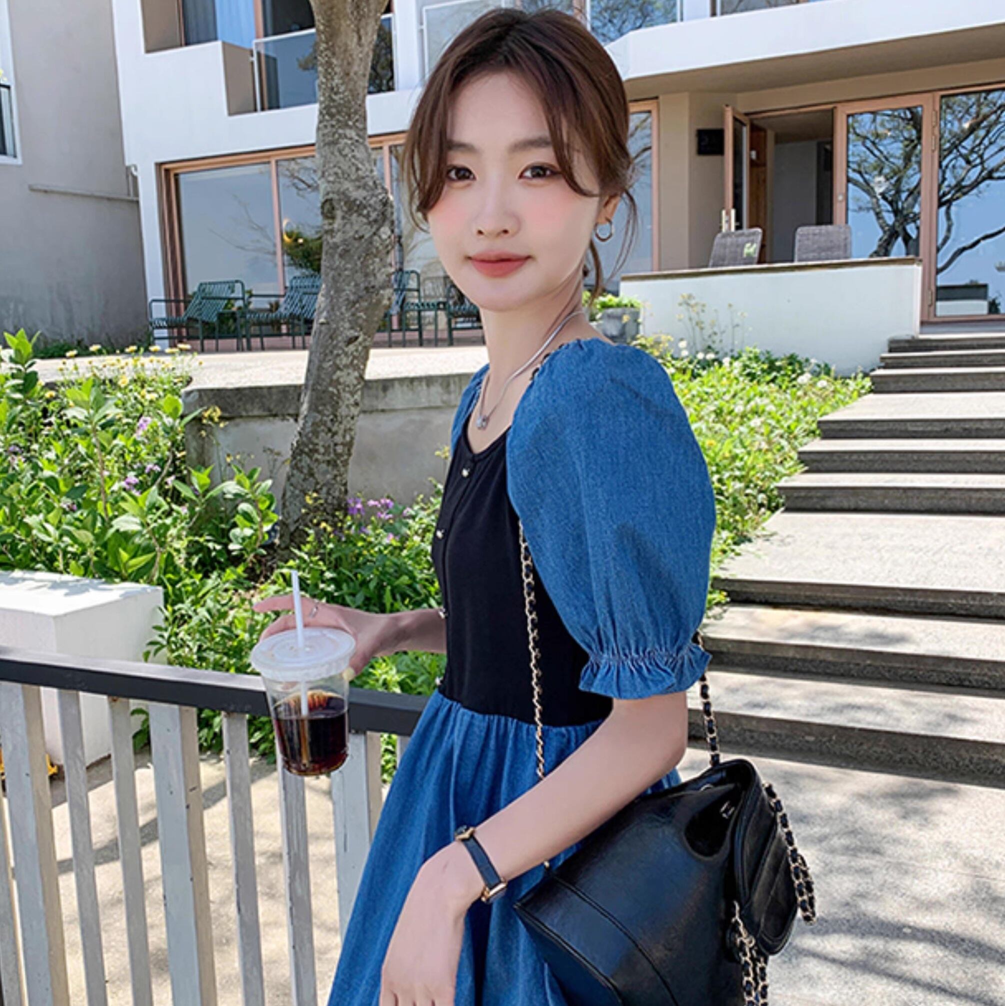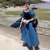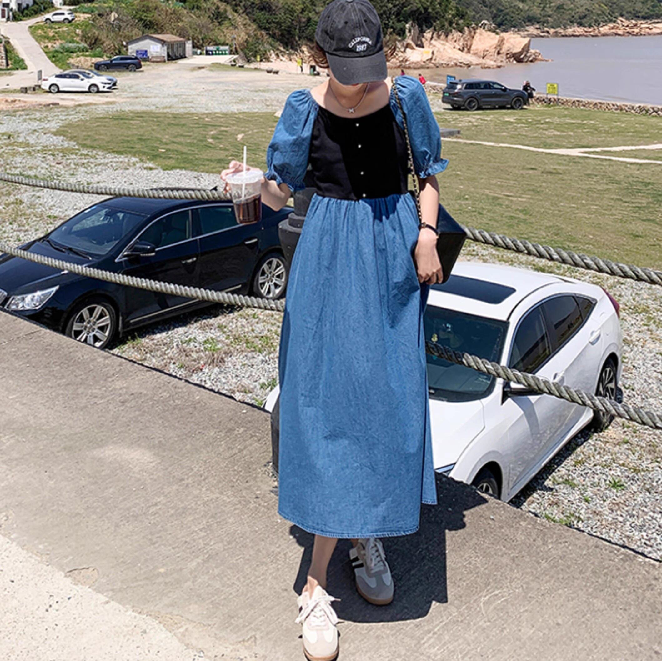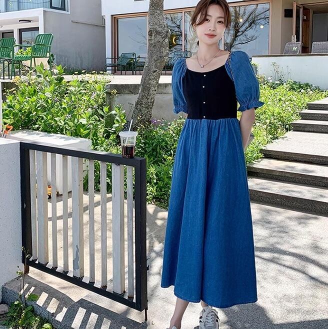ワンピース フレア デニム ロング マキシ 半袖 ボリューム袖 フレアスリーブ フリル袖 スクエアネック フェミニン ストリート ウエストマーク ハイウエスト 切り替えデザイン 配色 ドッキング ブルーデニム かわいい 大人可愛い カジュアル レトロ こなれ感 ガーリー 抜け感 ヴィンテージ ラブリー キュート ベーシック アメリカン プレッピー カントリー アクティブ ナチュラル 無地 夏 ママ お出かけ イベント リゾート 旅行 休日 バカンス 普段使い 着回し トレンド 流行 インスタ映え ブルー