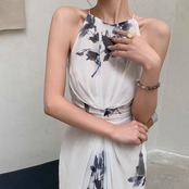 ワンピース ドレス ミモレ 袖なし ノースリーブ ホルターネック タイト スリム フェミニン シフォン ウエストマーク バックスリット ハイウエスト 異国風 きれいめ 上品 おしゃれ アジアン エスニック エキゾチック こなれ感 エレガント モダン 存在感 都会的 ラグジュアリー クラシカル ナチュラル 花柄 フラワー ボタニカル 夏 デート お出かけ パーティー イベント リゾート 旅行 海 プール ビーチ 重ね着 楽ちん 美脚 脚長 清楚 トレンド 流行 インスタ映え XS S M L 白 ホワイト