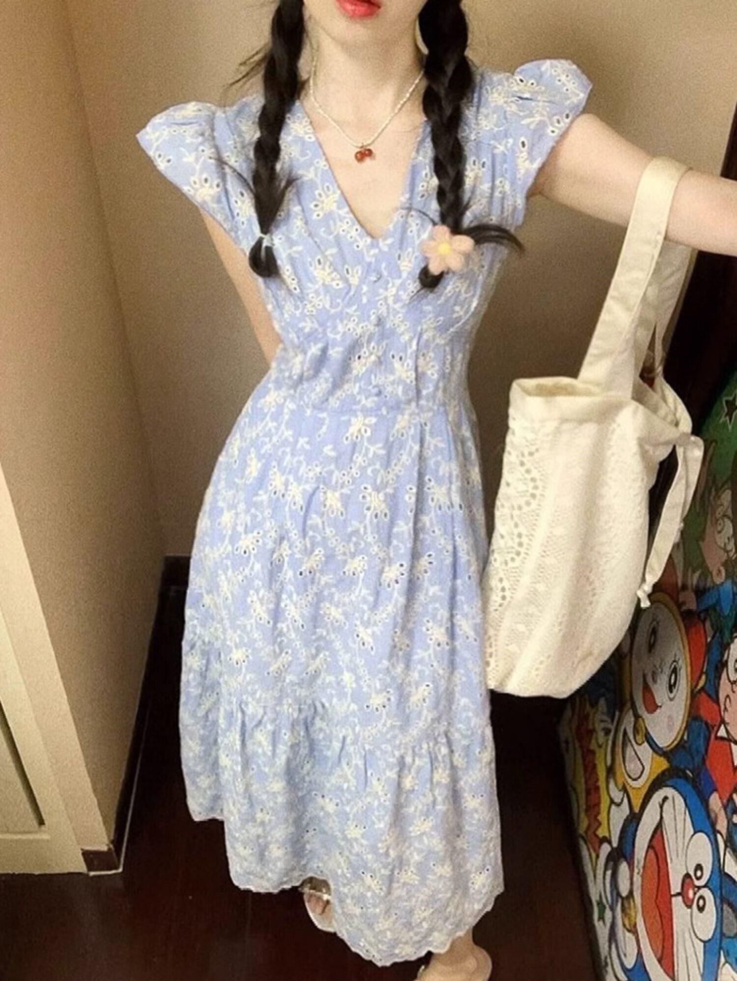 レディース ワンピース ドレス ワンピースドレス ワンピドレス ロング パフスリーブ フレンチスリーブ Vネック Aライン フェミニン レース 刺繍 ハイウエスト 透け感 ボタン かわいい 大人可愛い カジュアル おしゃれ ガーリー 主役級 存在感 抜け感 ラブリー キュート ロマンティック ナチュラル 花柄 フラワー 夏 デート お出かけ イベント リゾート 旅行 レストラン 女子会 休日 ショッピング カフェ 体型カバー 脚長 着回し モテ 清楚 S M L XL 水色 ライトブルー