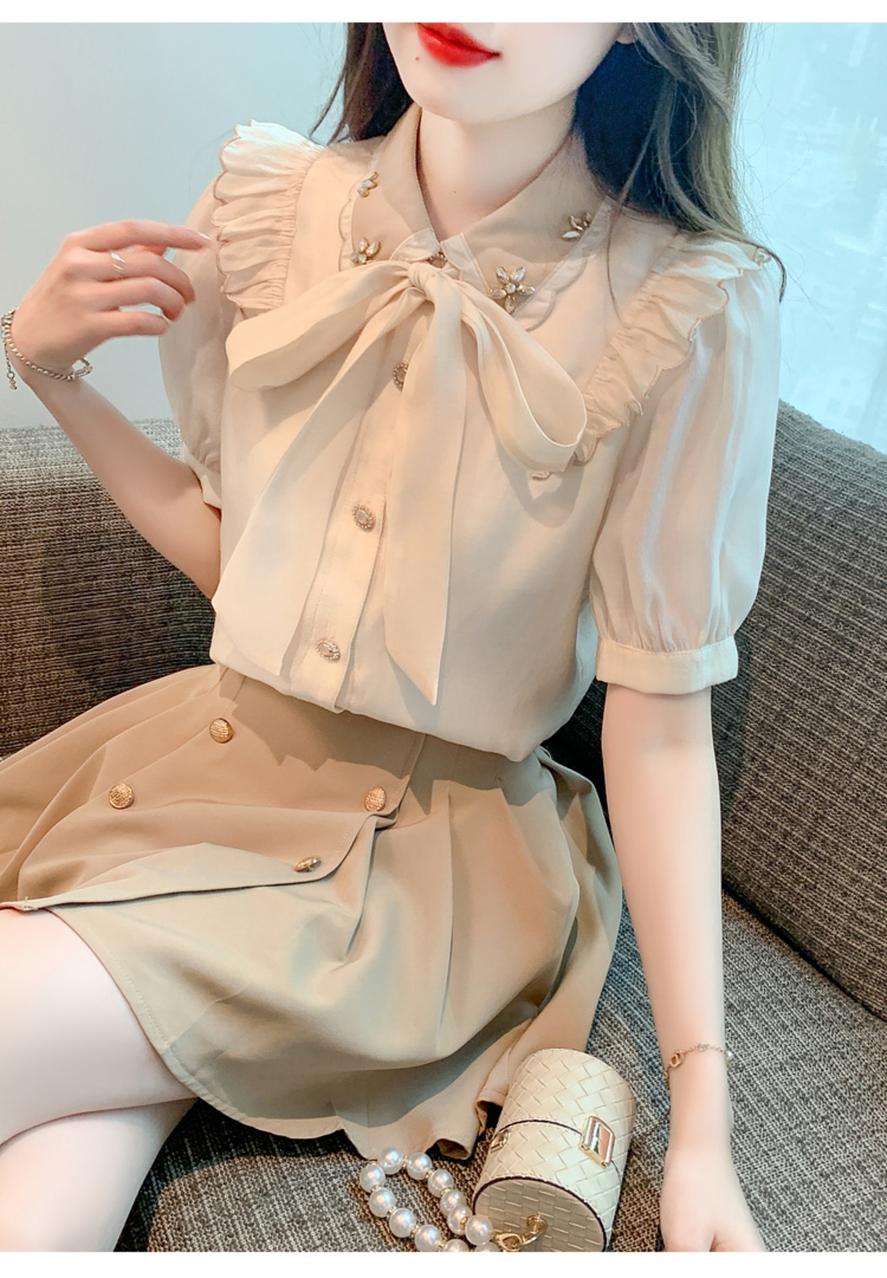 トップス ブラウス レディース 半袖 襟付き 角襟 りぼんタイ ワイド フレア フェミニン フリル リボン 前開き 薄手 かわいい 大人可愛い きれいめ シンプル 上品 おしゃれ こなれ感 ラフ ガーリー ルーズ エレガント 主役級 存在感 抜け感 ラブリー キュート プリンセス 都会的 ベーシック ロマンティック ナチュラル 春 夏 デート お出かけ ショッピング カフェ 着回し モテ 清楚 トレンド 流行 インスタ映え 定番 S M L XL 2XL アプリコット 大人カラー 春カラー 夏カラー