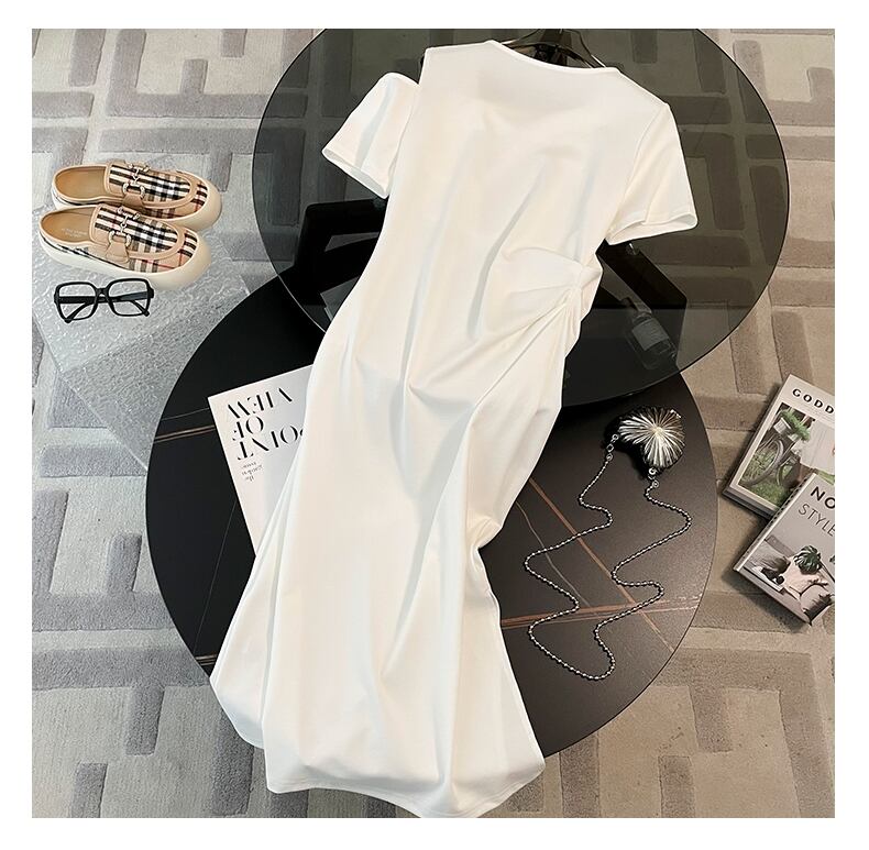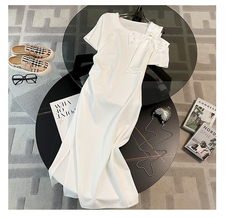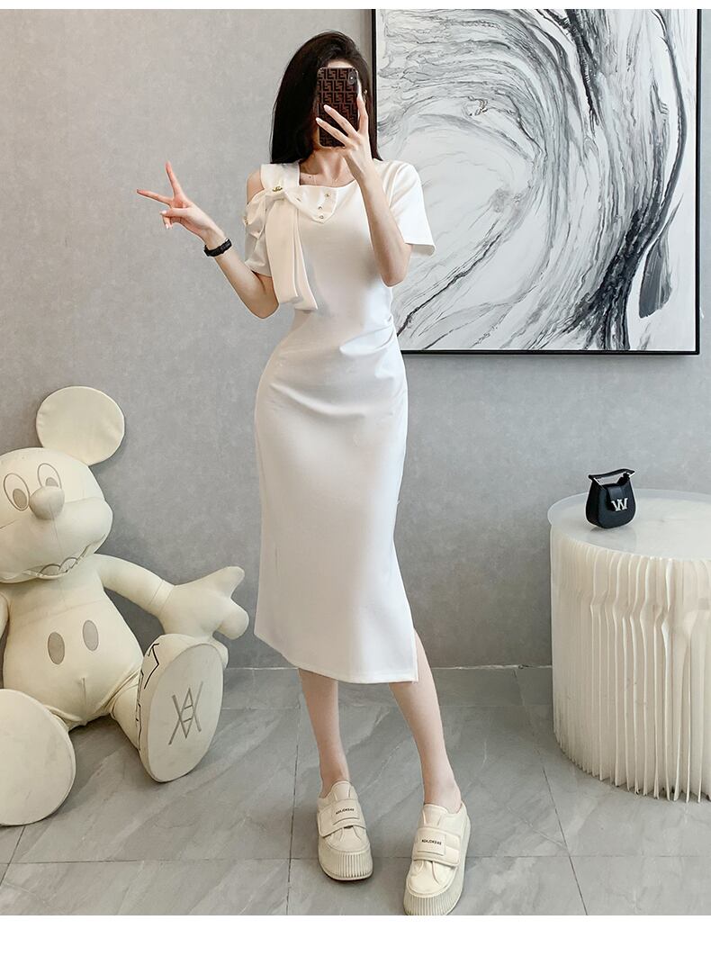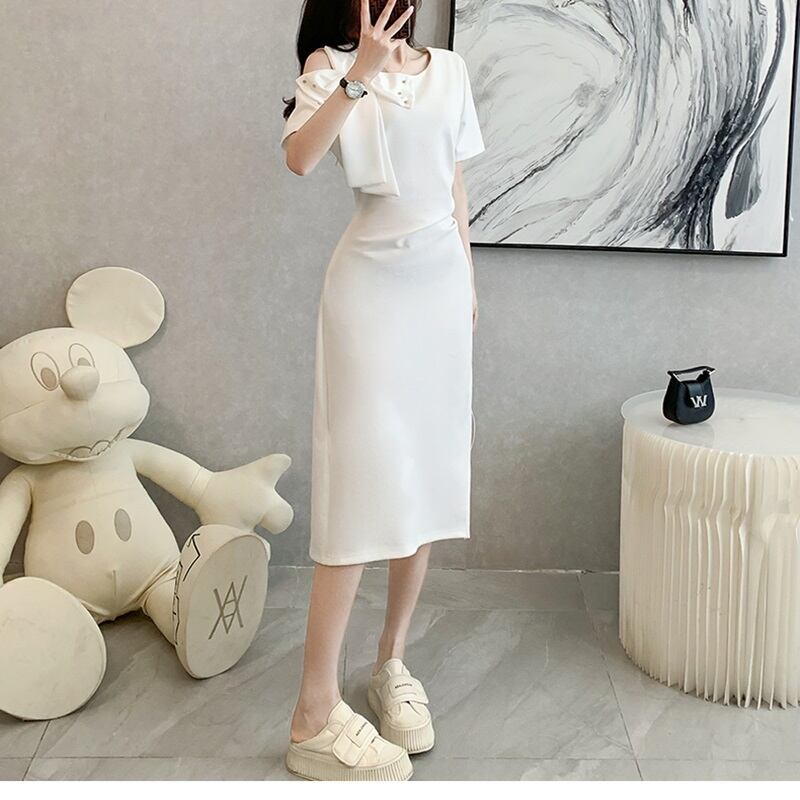 ワンピース レディース 膝下 ミモレ 半袖 ラウンドネック 襟なし タイト スリム 細身 リボン スリット 大人可愛い きれいめ シンプル 上品 おしゃれ こなれ感 ラフ 個性的 モード系 エレガント 主役級 存在感 とろみ感 抜け感 都会的 ベーシック ナチュラル 無地 春 夏 デート お出かけ パーティー イベント ショッピング カフェ コーデ 美脚 脚長 モテ 清楚 トレンド 流行 インスタ映え 定番 S M L XL 白 ホワイト ベーシックカラー 大人カラー 春カラー 夏カラー