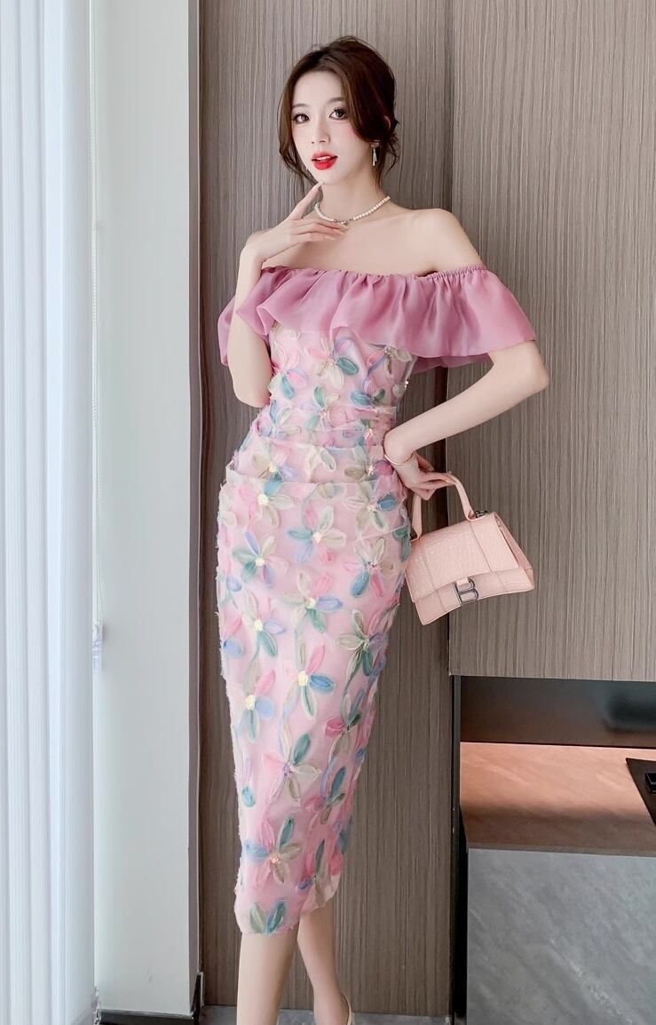 ワンピース レディース ドレスワンピース タイトスカート 膝下 ミモレ フリル袖 スクエアネック オフショルダー タイト スリム 細身 マーメイド レース 刺繍 フリル ウエストマーク 大人可愛い きれいめ おしゃれ エキゾチック こなれ感 ガーリー 個性的 エレガント 存在感 フォーマル ラグジュアリー ロマンティック 花柄 フラワー 総柄 夏 二次会 披露宴 デート お出かけ パーティー イベント リゾート レストラン 休日 バカンス ホテル ガーデン 脚長 S M L XL ピンク