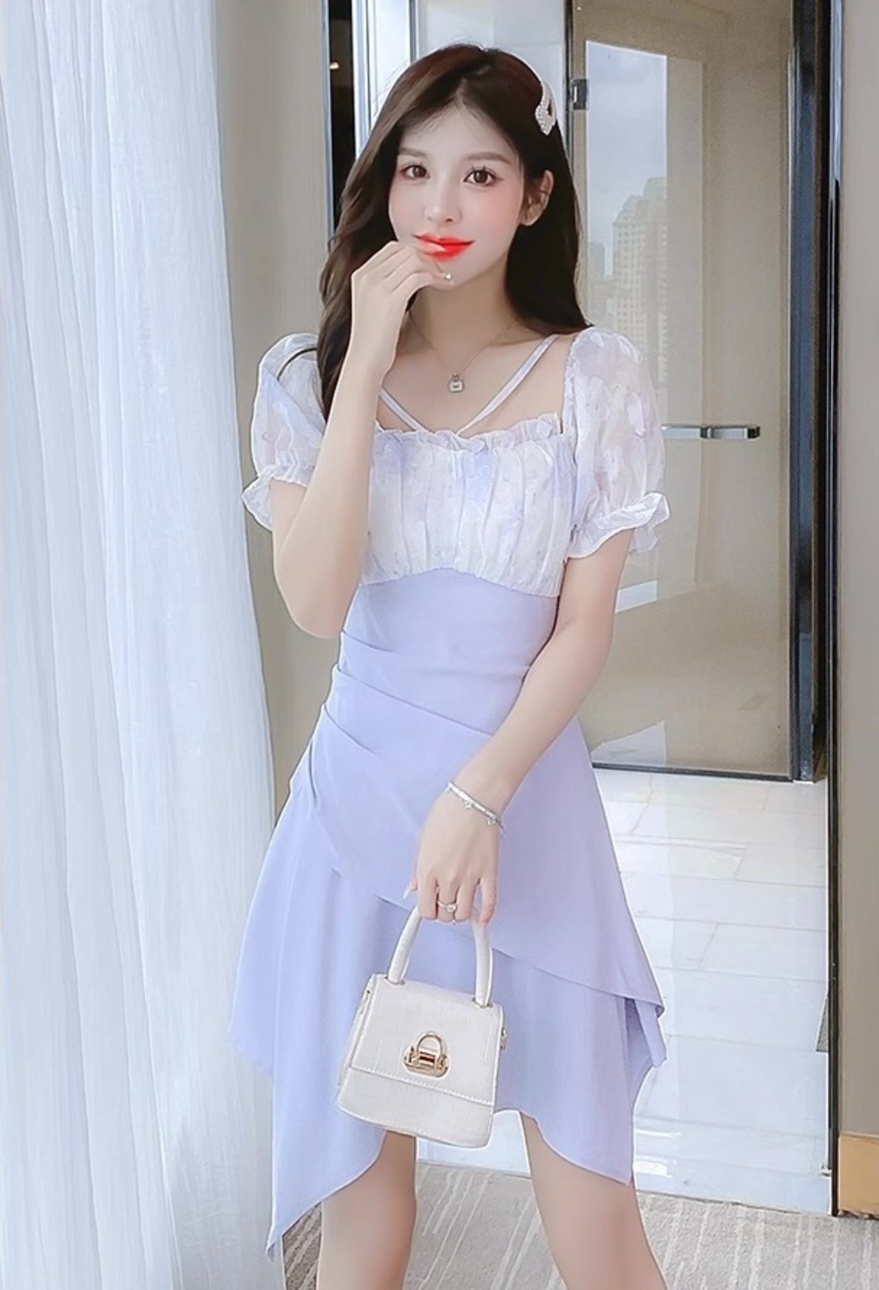 透け感のあるパフスリーブが二の腕のカバーとこなれ感を演出し、夏らしい装いにしてくれます。