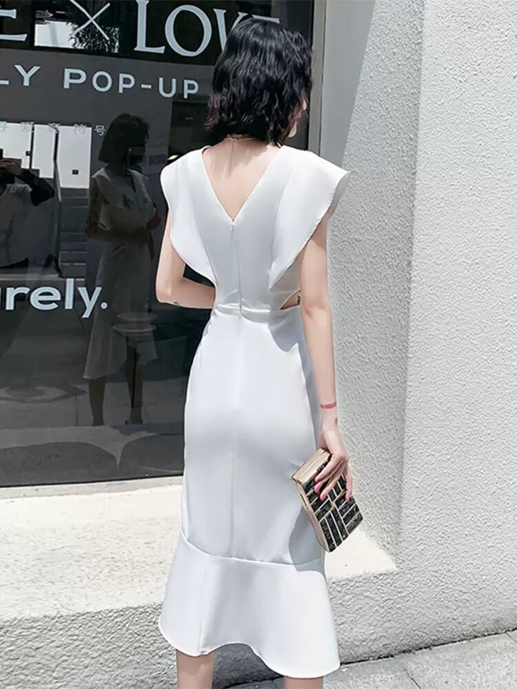 レディース ワンピース ドレス ワンピースドレス 膝丈 ミモレ フレアスリーブ フレンチスリーブ Vネック タイト スリム ストレート フィッシュテール フェミニン フリル ウエストマーク スリット ハイウエスト 切り替えデザイン カットアウト カットワーク アシンメトリー 大人可愛い きれいめ シンプル 上品 おしゃれ かっこいい エレガント 主役級 存在感 抜け感 都会的 ラグジュアリー 無地 夏 デート お出かけ パーティー イベント XS S M L XL 2XL 3XL ホワイト ワインレッド