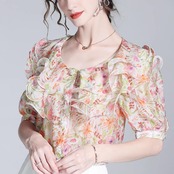 トップス シャツ ブラウス レディース 5分袖 ラウンドネック 襟付き 丸襟 フェミニン シフォン フリル かわいい 大人可愛い きれいめ 上品 おしゃれ レトロ ガーリー エレガント 抜け感 ラブリー キュート ロマンティック ナチュラル ヘルシー 花柄 フラワー 春 夏 デート お出かけ イベント 休日 合コン コンパ カフェ 婚活 普段使い 着回し 清楚 トレンド 流行 インスタ映え S M L XL 2XL 3XL 小さいサイズ 大きいサイズ ビッグ ゆったり ゆる ピンク 春カラー パステル