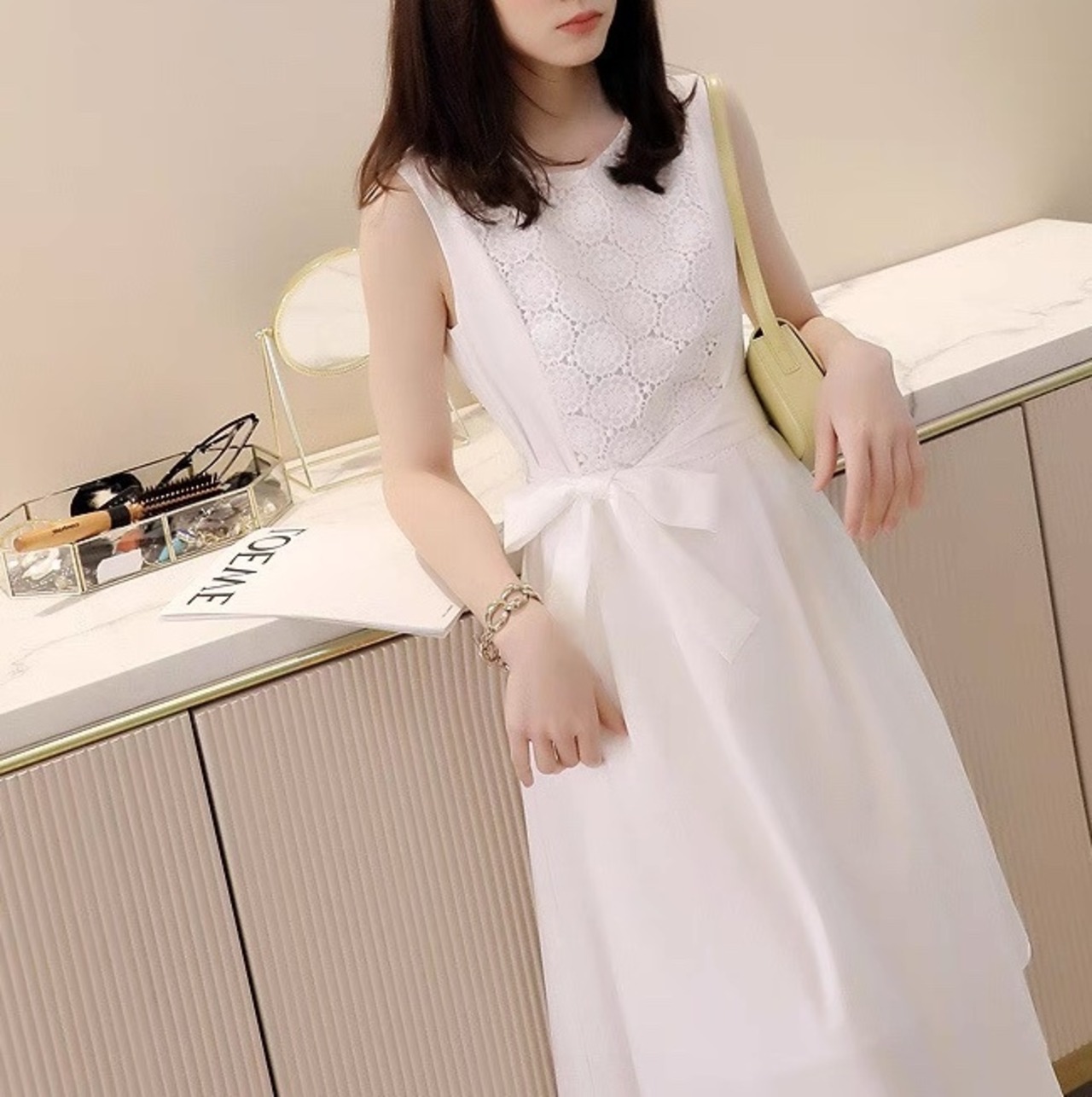 ワンピース レディース フレア 膝丈 袖なし ノースリーブ ラウンドネック Aライン フェミニン レース 刺繍 リボン ウエストマーク ウエストリボン 切り替えデザイン ドッキング かわいい 大人可愛い きれいめ 上品 おしゃれ レトロ ガーリー 存在感 抜け感 ラブリー キュート プリンセス ロマンティック ナチュラル ヘルシー 夏 デート お出かけ イベント リゾート 旅行 海 レストラン ビーチ 休日 コーデ 楽ちん 美脚 脚長 清楚 トレンド 流行 インスタ映え S M L XL 白 ホワイト