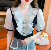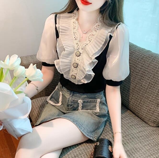 トップス シャツ ブラウス レディース 半袖 5分袖 ボリューム袖 パフスリーブ Vネック フェミニン レース 刺繍 シフォン フリル ボタン ヴィンテージ 切り替えデザイン バイカラー 配色 ドッキング かわいい 大人可愛い おしゃれ レトロ ガーリー エレガント モダン 主役級 存在感 フォーマル ラブリー キュート ロリータ 都会的 ラグジュアリー クラシカル ロマンティック 無地 春 夏 お出かけ イベント 休日 普段使い 着回し 清楚 トレンド 流行 インスタ映え S M L XL 黒 ブラック