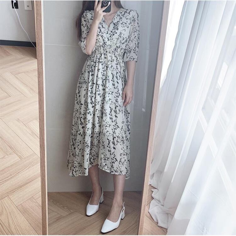 ワンピース レディース フレア ミモレ ロング 5分袖 ボリューム袖 フリル袖 Vネック カシュクール Aライン フェミニン シフォン ウエストマーク ハイウエスト かわいい 大人可愛い おしゃれ レトロ ガーリー 抜け感 ラブリー キュート ベーシック アメリカン カントリー ロマンティック ナチュラル ヘルシー 花柄 フラワー 春 夏 秋 デート お出かけ イベント リゾート 女子会 休日 美脚 脚長 普段使い 着回し 清楚 トレンド 流行 インスタ映え S M L XL 白 ホワイト 黒 ブラック