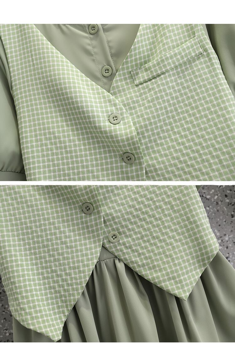 チェックのベストをレイヤードしたような半袖ロングワンピース。